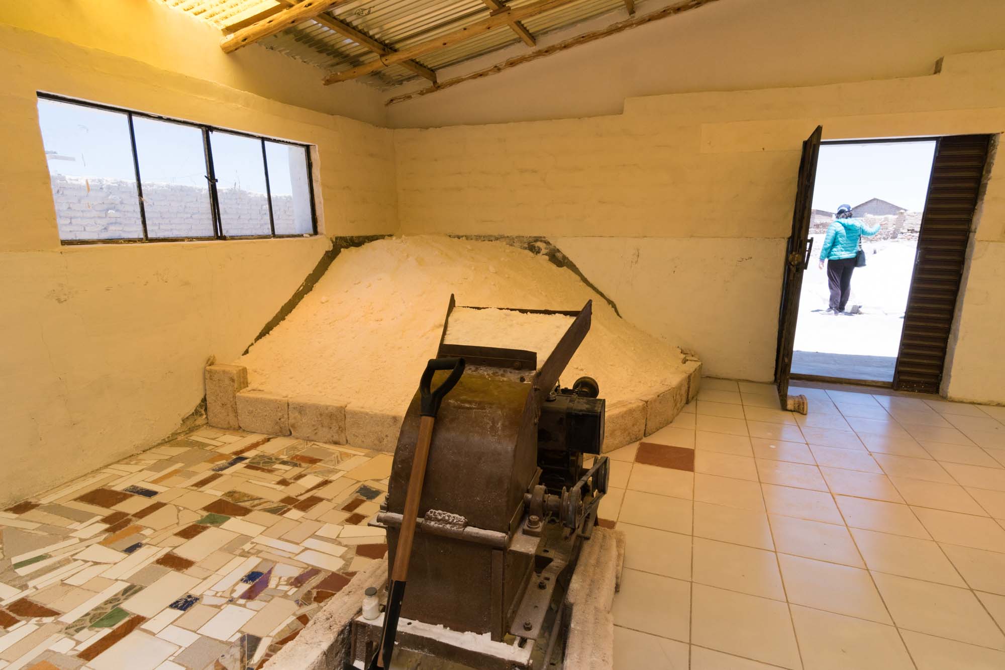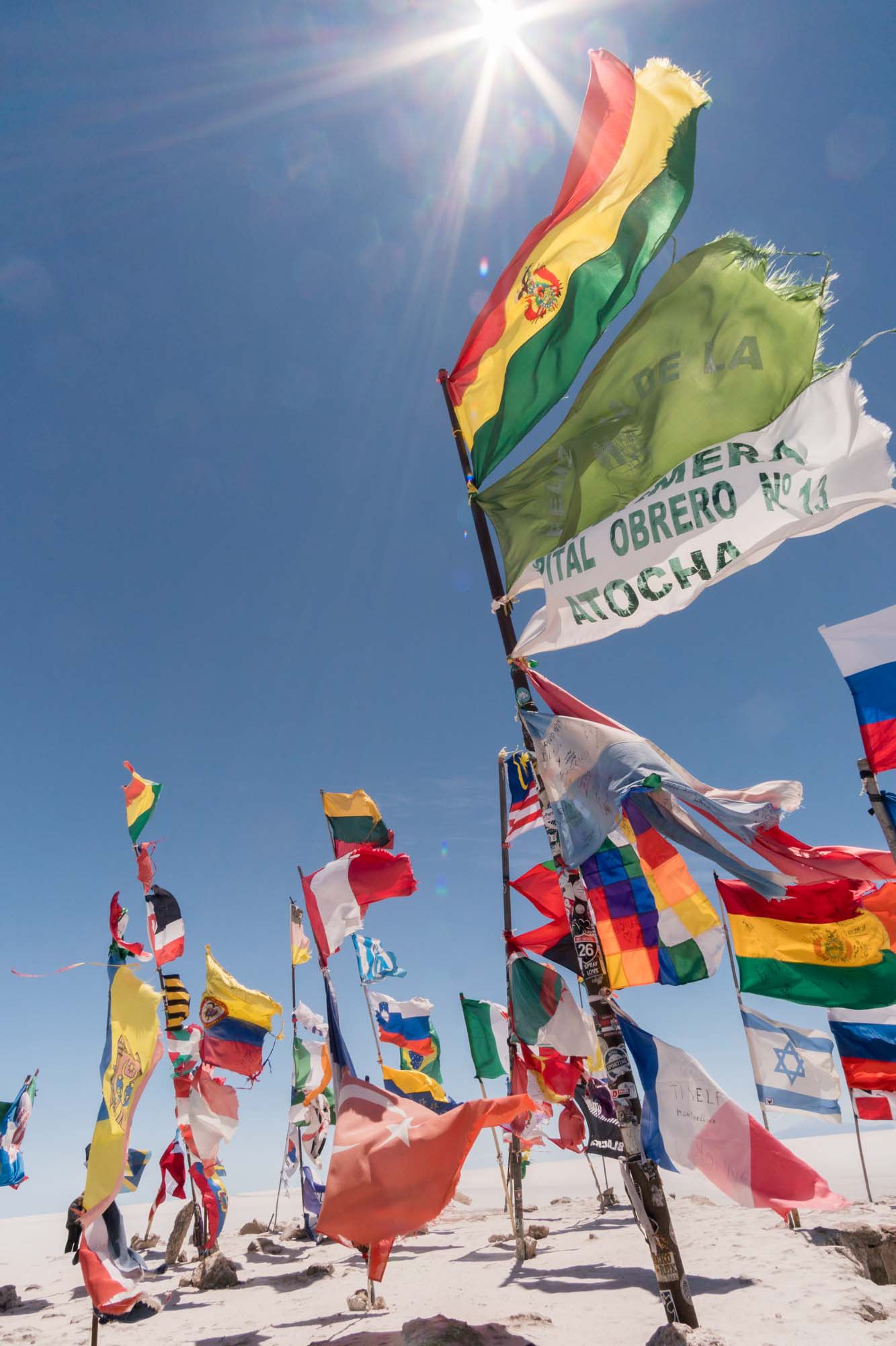 Unser erster Stopp ist der Eisenbahnfriedhof keine 10 Min außerhalb Uyunis. Erstaunlich ist der „gute“ Zustand der Lokomotiven und Anhänger, die hier auch schon für gut 130 Jahre stehen. Die Züge wurden in England und Frankreich gebaut und dienten dem Mineralabtransport in Richtung Chile. Nach einer guten halben Stunde Zeit für Fotos geht es nochmals kurz zurück nach Uyuni um unseren Proviant für die nächsten Tage einzuladen. Auf dem Weg in die Salzwüste machen wir noch kurz in einer Salzfabrik in Colchani halt. Das von Hand abgetragene, über dem Holzfeuer getrocknete und verpackte Salz aus der Wüste wird hier für 10 Bolivianos das Kilo, umgerechnet etwas mehr als 1 € verkauft. Unser Mittagessen genießen wir im ehemaligen ersten Hotel in der Salzwüste, Hotel Playa Blanco, direkt am Dakar Monument (die Rallye Dakar führte 2015 – wie auch 2018 – durch die Salar de Uyuni). Nach einem guten und ausgiebigen Mittagessen mit Quinoa, Rindfleisch und Salat, machen wir uns auf den Weg in die Mitte der Wüste. Die unendlich scheinende Weite und das helle weiße Licht, das vom Salz reflektiert wird, sind sehr beeindruckend und kaum in Bilder oder Worte zu fassen. Irgendwo im nirgendwo, ich habe längst die Orientierung verloren, Eva sowieso :-), hält unser Fahrer an. Es entstehen durch die Verzerrung der Perspektive lustige Bilder. Eine halbe Autostunde später kommen an einer kleinen Inselgruppe, die sich aus dem Salz erhebt, an. Von den Felsen hat man einen super Ausblick auf die unglaubliche Weite der Salzwüste sowie die umgebenden Berge – einfach gigantisch! Der letzte Stopp des Tages führt uns zu einer kleinen Höhle. Von außen sehr unscheinbar doch nachdem der Generator für die Stromversorgung extra für uns angeworfen wird und es Dank Energiesparlampe spärlich hell wird, staunen wir nicht schlecht. Ein kleiner Raum eröffnet beeindruckende Versteinerungen von Algen und Pflanzenresten an Decke und Wänden. Teilweise kann man noch die Blattadern erkennen. Nach einer weiteren Autofahrt kommen wir in unserem ersten Hotel in der Wüste an – dem Salzhotel. Wir haben – wider Erwarten – ein Doppelzimmer mit eigener Dusche und WC :-). Nach dem Abendessen und einem kurzen Blick zum Himmel und der Milchstraße fallen wir ziemlich erschöpft in unser Bett und in einen tiefen Schlaf ;-).