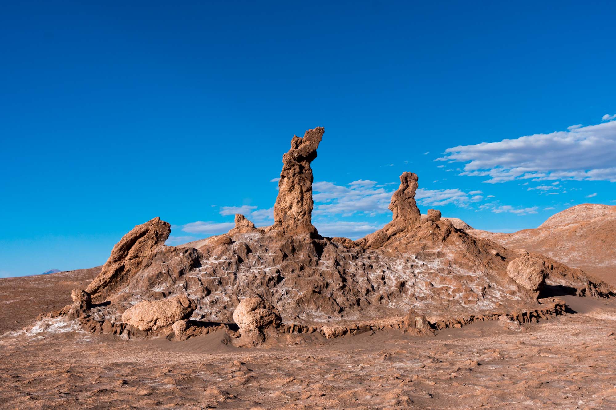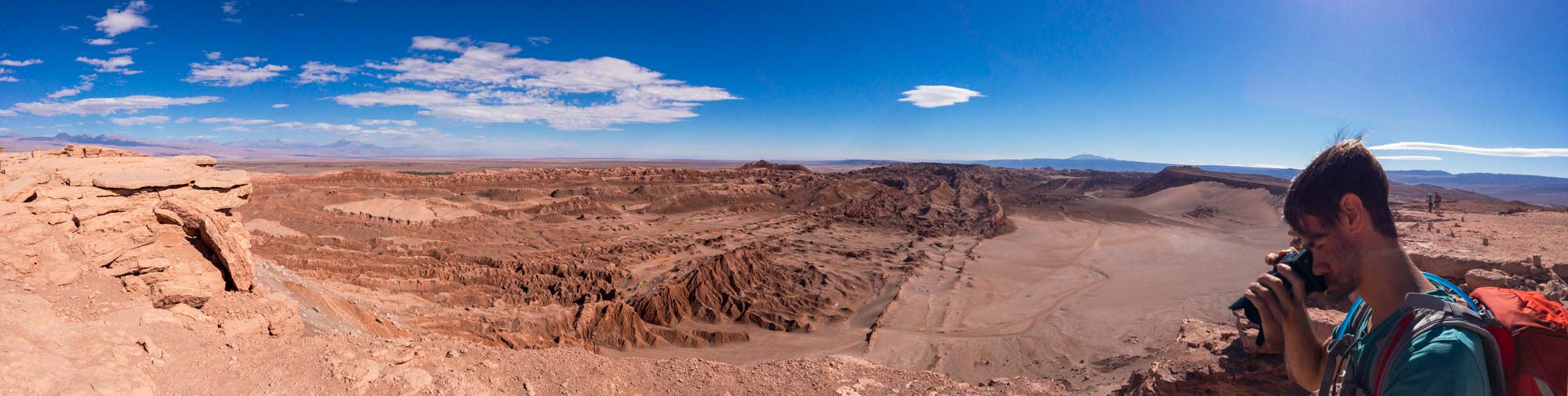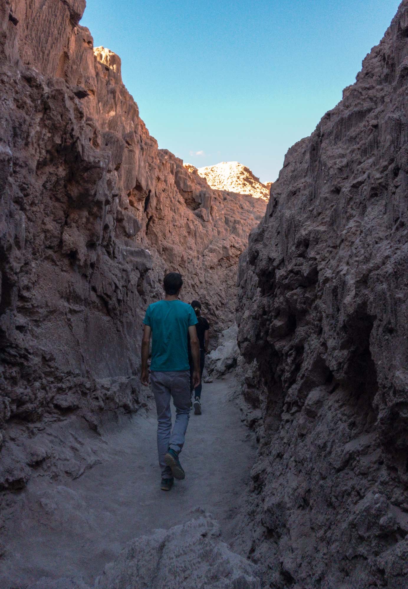 Der nächste Morgen begann für mich um 9.20 Uhr während Marin etwas länger im Bett liegen blieb und erst um 10.30 Uhr aus den Federn kam. Wir hatten auch keine Eile, denn unsere Tour in das nahe gelegene Valle de la Luna war erst auf 16 Uhr angesetzt. Da das lange Wochenende der Chilenen, am 12. Oktober war Kolumbus-Tag, vorbei war, waren wir heute nur 5 Personen für diese Tour und so wurden wir zu einem anderen Touranbieter umgebucht. Wir fuhren mit einem kleinen Bus zunächst auf eine kleine Anhöhe, von wo aus wir einen tollen Überblick über das Tal aus Sanddünen und Felsen hatten. Danach führte uns unser Guide in eine Salzschlucht die kurze Zeit später zu einer Höhle wurde. Über Jahrhunderte wusch das Wasser diesen wunderbaren Canyon aus und formte bizarre Salzkristalle.