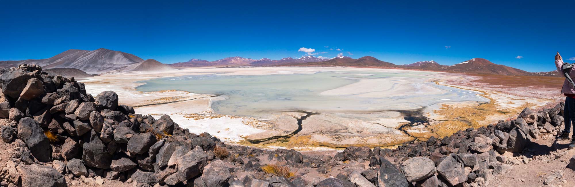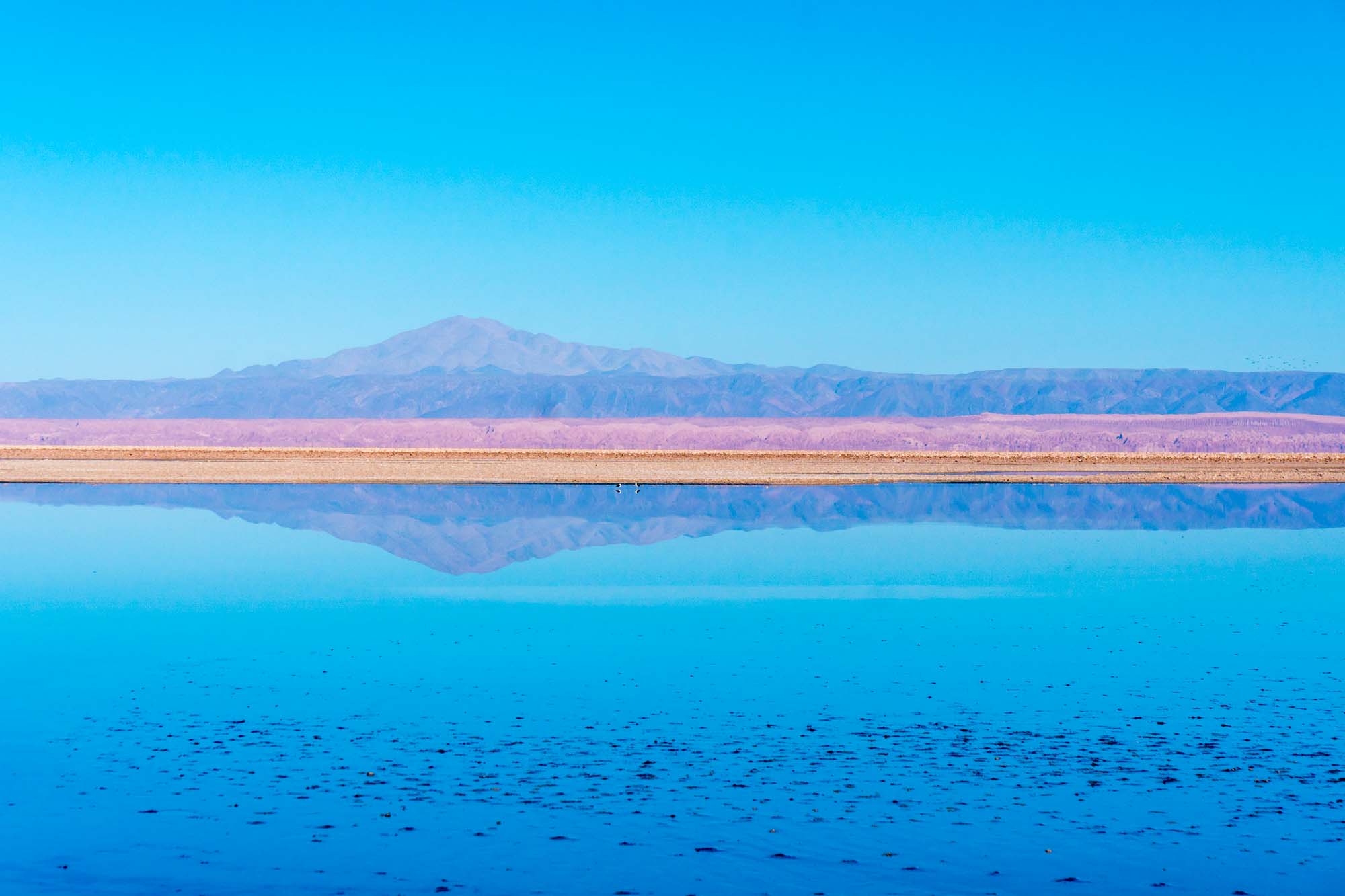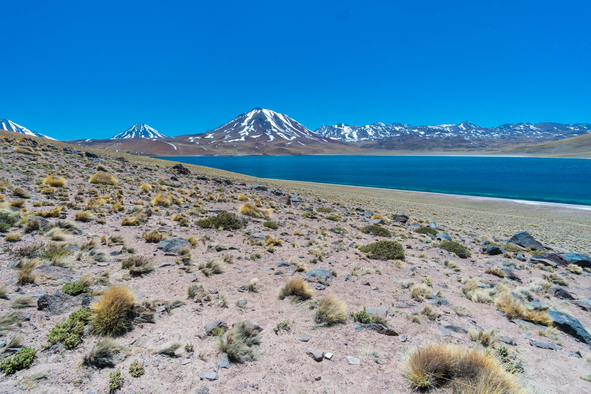 Unser letzter Tag in San Pedro ist angebrochen. Nach fast einer Woche heißt es ein letztes Mal in die weite trockene Landschaft fahren. Wir werden, wider Erwarten, pünktlich von einem gut englisch sprechenden Guide um 7.10 Uhr abgeholt. Nachdem alle Teilnehmer eingesammelt waren, geht es Richtung Süden. Das erste Ziel ist die Laguna Chaxa. An der spiegelglatten Lagune leben verschiedene Vögel. Unter anderem Flamingos und verschiedene Pfeiferarten. Wir sind jedoch aus Bolivien sehr viel mehr Flamingos gewohnt und so warten wir ungeduldig darauf, dass unser Guide das Frühstück fertig hat. Wir merken, dass wir diesmal mit einer guten Agency unterwegs sind. Die Becher sind nicht aus Styropor sondern wiederverwendbar aus Metal. Es gibt frische Avocado und zum ersten Mal auch Coca-Tee. Wir probieren gleich eine Tasse, müssen aber feststellen, dass er nicht außergewöhnlich schmeckt. Er ist trinkbar aber, dass ich sagen würde es war ein Highlight unserer Reise, ist er auch nicht. Er wird wohl eher für seine Wirkung gegen die Höhenkrankheit geschätzt. Es geht weiter zum Aussichtspunkt der Piedras Rojas (Rote Felsen). Leider ist es seit ein paar Monaten nicht mehr erlaubt, direkt an die Lagune zu gehen und dort auf den roten Felsen herumzulaufen. Zwei Windsurfer aus Brasilien surften dort illegal und seitdem ist das Gebiet für Touristen komplett gesperrt. Unser südlichstes und gleichzeitig höchstgelegenes Ziel mit fast 4500 m ü NN ist die Lagune Tuyajto. Hier windet es so sehr, dass es einen fast von der Stelle weht. Kombiniert mit den frischen Temperaturen am Morgen ist es ganz schön unangenehm und so versuchen wir im Windschatten einer kleinen Mauer den Ausblick zu genießen. Auf dem Rückweg Richtung San Pedro machen wir an zwei tiefblauen Lagunen, Laguna Miniques und Laguna Miscanti, halt. Früher waren diese beiden Lagunen miteinander verbunden, doch nach einem Vulkanausbruch trennt nun ein erkalteter Lavastrom die beiden Lagunen voneinander. Unser Mittagessen bekommen wir in einer kleinen Halle zusammen mit einer französisch sprechenden Gruppe serviert. Es gibt zur Vorspeise eine leckere Gemüsesuppe, als Hauptgang entweder ein vegetarisches Gemüseomelette oder Hühnchen mit Reis, Quinoa und Salat. Den Nachtisch verweigere ich, denn es gibt Götterspeise. Nach dem Mittagessen ist Marin satt und döst ein wenig im Auto während unser Fahrer die knapp 120 km zurück nach San Pedro fährt.